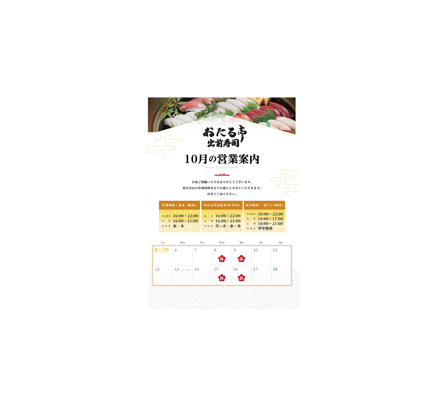 10月 祝日付近営業のお知らせ