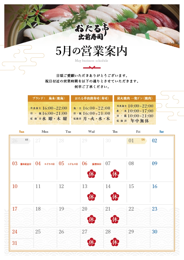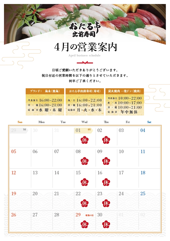 4月5月の営業カレンダーをご用意いたしました。